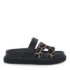 Ciabattone con due fasce regolabili tramite fibbie dorate. Le fasce sono realizzate in un elegante materiale intrecciato con motivi geometrici