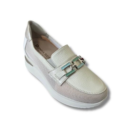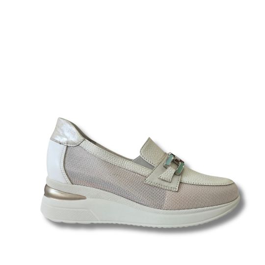 Mocassino donna in pelle e tessuto con zeppa alta 5 cm.