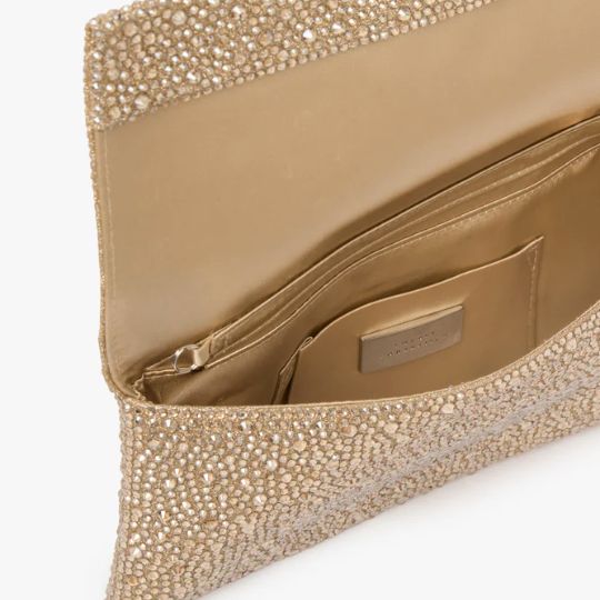 Pochette Siria realizzata con superficie rivestita di mini cristalli, caratterizzata da una struttura compatta e una resa luminosa uniforme. Il design essenziale è completato da una tracolla removibile che consente una portabilità versatile, mantenendo proporzioni pulite e una costruzione equilibrata.