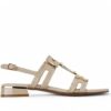 Sandalo con struttura a cinturino in pelle con dettagli geometrici sul collo del piede e sulla caviglia.