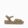 Sandalo in rafia, con fascia sul davanti, cinturino al tallone con fibbia regolabile, fondo gomma con tacco zeppa di cm 7 e plateaux di cm 3.