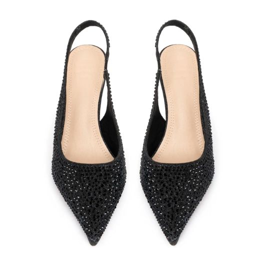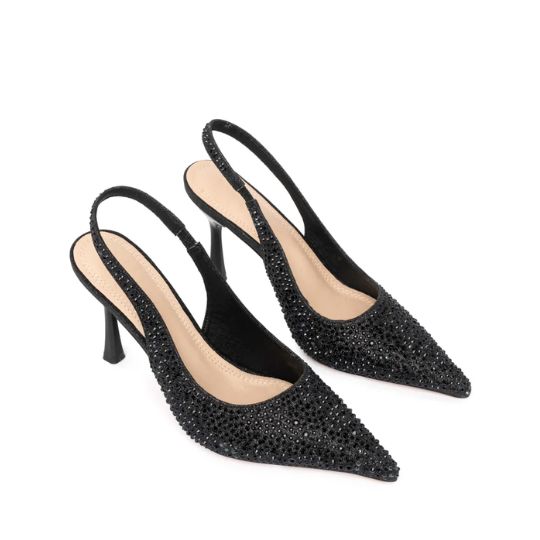 Slingback Eindhoven realizzata in materiale glitter, caratterizzata da una superficie interamente tempestata di cristalli applicati in modo uniforme per una resa luminosa compatta. La costruzione mantiene una linea definita e slanciata, valorizzando la lavorazione full crystal senza appesantire le proporzioni. Il tacco da 9 cm struttura la silhouette della calzatura garantendo una resa stabile e una vestibilità regolare.