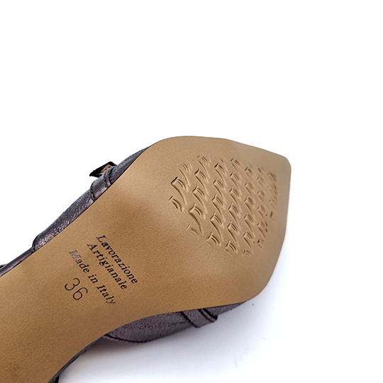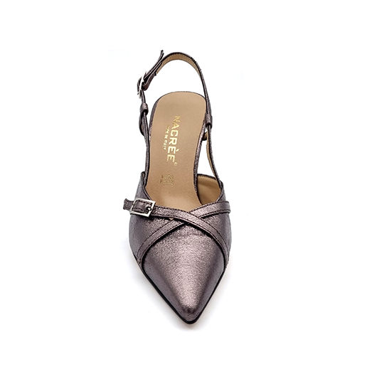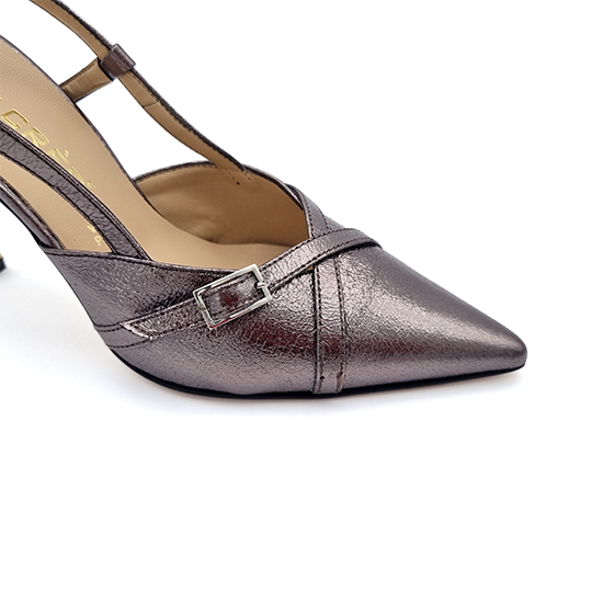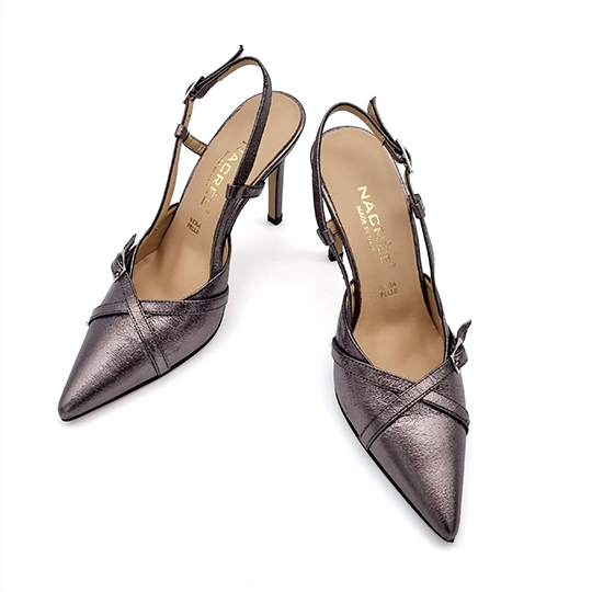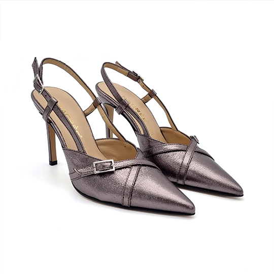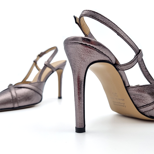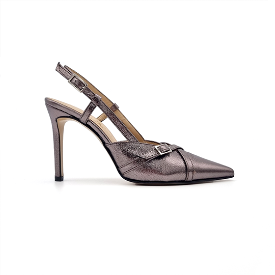 Slingback in ecopelle laminata, sottopiede in pelle e chiusura cinturino. Altezza tacco 10,5 cm Art. 1742-003