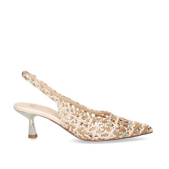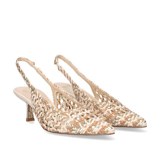 Slingback in ecopelle intrecciata con tacco di 6 cm per uno stile elegante e confortevole. Fondo sintetico e design raffinato, perfetto per completare outfit da giorno o da sera con un tocco luminoso.