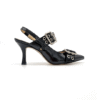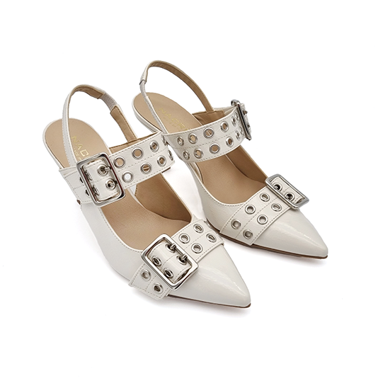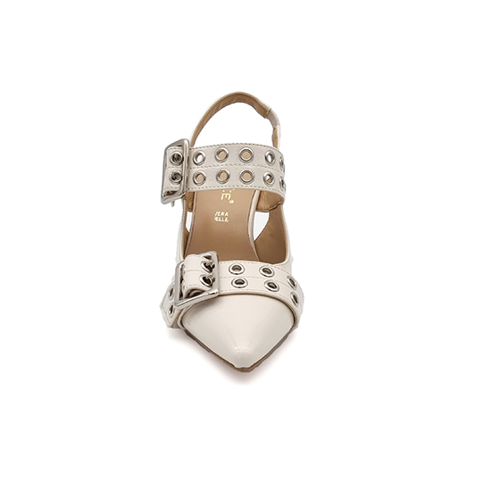 Slingback in naplak caratterizzate da una punta affusolata e un tacco a stiletto sottile per un’andatura sofisticata. Il design è arricchito da due cinturini che avvolgono il piede, decorati con occhielli metallici argentati e fibbie rettangolari, conferendo un tocco moderno e grintoso a questa calzatura classica.