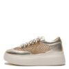Sneakers stringate, suola box in EVA leggera, pelle martellata laminata e rafia abbinata sul lato, dettaglio di strass sull’allacciatura.